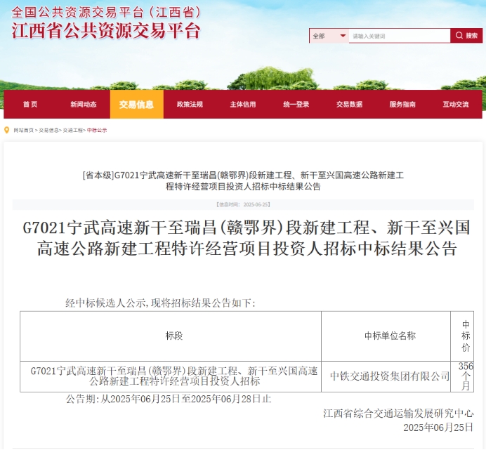 6月19日,G7021寧武高速新干至瑞昌(贛鄂界)段及新干至興國高速公路新建工程特許經營項目投資人招標在省公共資源交易集團(省公共資源交易中心)(以下簡稱“省交易集團”)順利完成招標工作。
